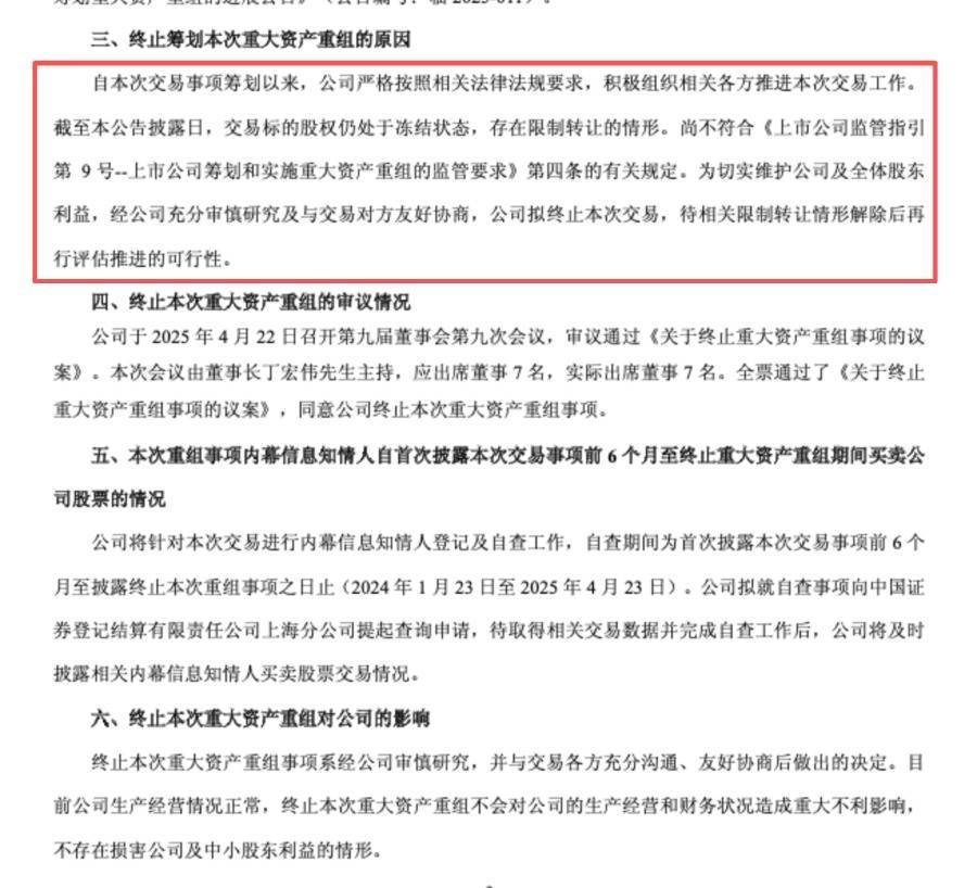 2025年4月,国中水务披露,由于交易标的(诸暨文盛汇)股权仍处于冻结状态,存在限制转让的情形,尚不符合《上市公司监管指引第 9 号--上市公司筹划和实施重大资产重组的监管要求》第四条的有关规定。经公司充分审慎研究及与交易对方友好协商,公司拟终止收购行为,待相关限制转让情形解除后再行评估推进的可行性。