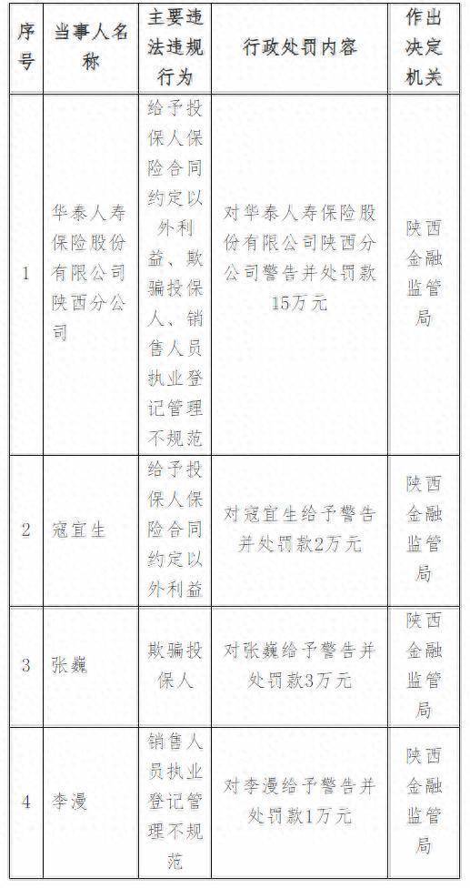 其中,华泰人寿陕西分公司被警告并罚款15万元;责任人寇宜生因涉及给予合同外利益被警告并罚款2万元,张巍因欺骗投保人被警告并罚款3万元,李漫因执业登记管理不规范被警告并罚款1万元,合计被罚21万元。